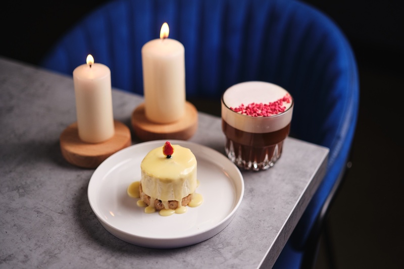 - Десерт «Воспоминание» (чизкейк в виде свечи с творожным сыром и сгущенкой на основе из молотого миндаля и белого шоколада), 90 г