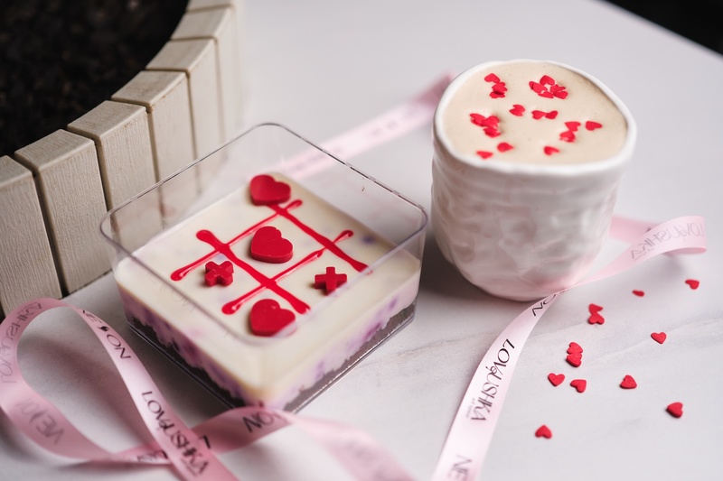 - Десерт «Игра в кальмара»: Ванильный бисквит, нежный мусс на белом шоколаде, начинка лимон-каламанси или нежный брауни на основе темного шоколада с кофейно-карамельным муссом, с начинкой из молочного шоколада с ноткой меда (десерт попадается рандомно), 140 г