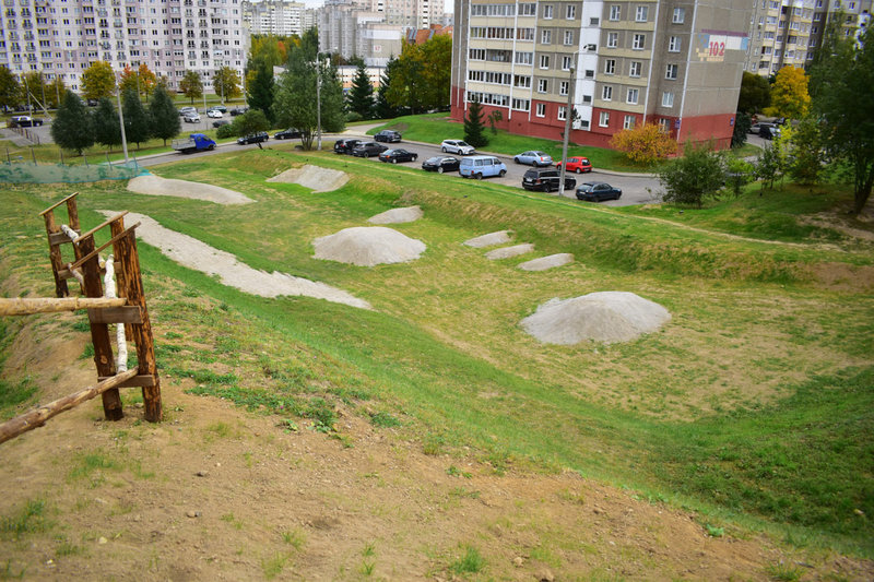 Работы еще не завершены Территория довольно большая. Она разделена на две части – тюбинг-трасса и велотрек, причем последний еще не достроен. Тут нет дорожек, и выглядит трек как большая ложбина с горочками.