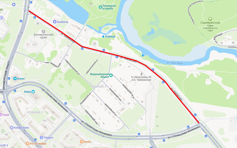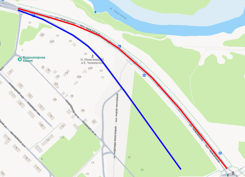 Теперь улица открыта, но по новой трассировке. Мы отметили на карте красным цветом новый участок, а синим — старую улицу Чижевских.