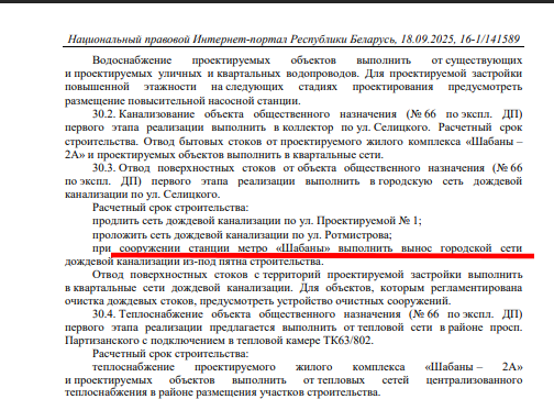 В документе, который опубликован на Национальном правовом интернет-портале сказано, что при сооружении станции метро «Шабаны» необходимо будет выполнить вынос городской сети дождевой канализации из-под пятна строительства.