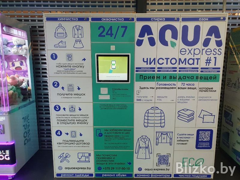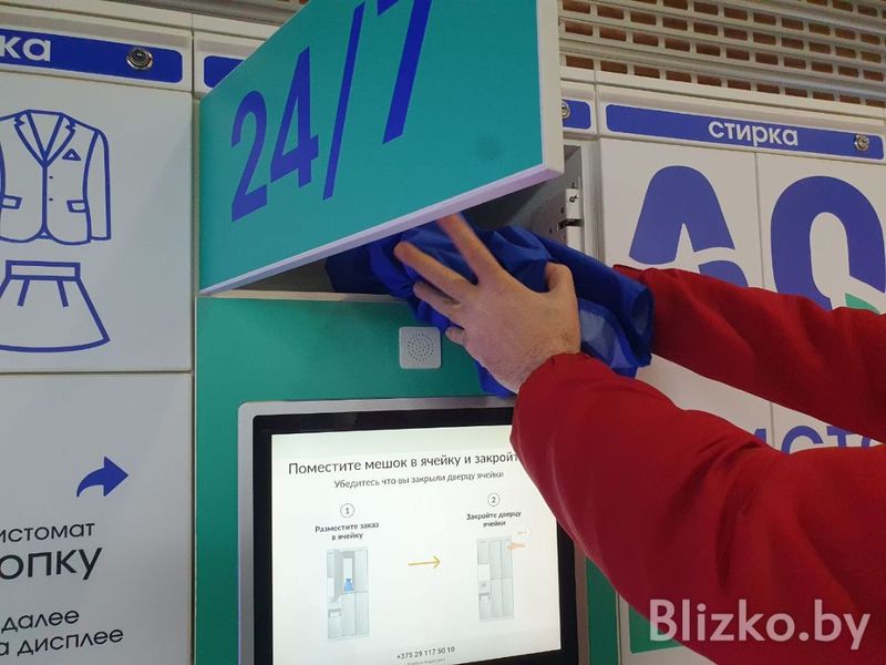 По факту конструкция похожа на камеру хранения с несколькими ячейками. Сдав сюда вещи, можно заказать услуги химчистки, аквачистки, прачечной или стирки. Для Минска — это новый вид бытовых услуг. На сегодняшний день в городе представлены всего несколько штук, но от разных компаний. Работают они под брендами «Белхимчистка» и «Акваэкспресс». Мы воспользовались услугами последнего.