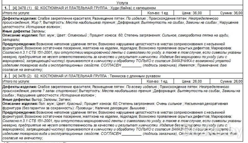 Здесь же, в форме описания вещей, содержится и предупреждение от прачечной. Для двух наших вещей оно одинаковое: «Возможно неполное удаление пятен. Возможно нарушение целостности в местах соприкосновения с фурнитурой. Возможно остаточное посерение, желтизна на изделии, подкладке. Возможно появление скрытых дефектов».