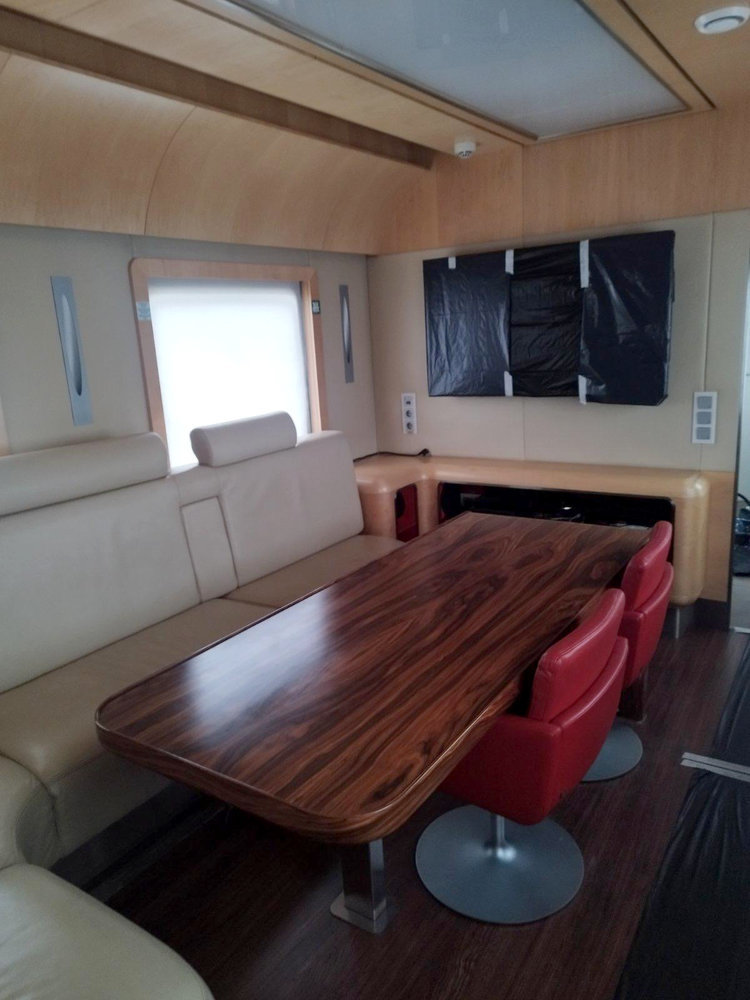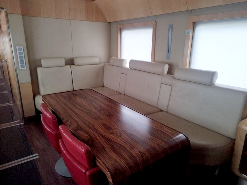 Также значительную часть вагона занимает собственно бизнес-салон. Здесь стоит большой угловой диван, прямоугольный стол и два жестко закрепленных кресла. Над всей этой зоной — широкий плафон освещения, а противоположную от дивана стенку занимает большой плоский телевизор. Также в салоне можно заметить множество выключателей, розеток и пожарные извещатели.