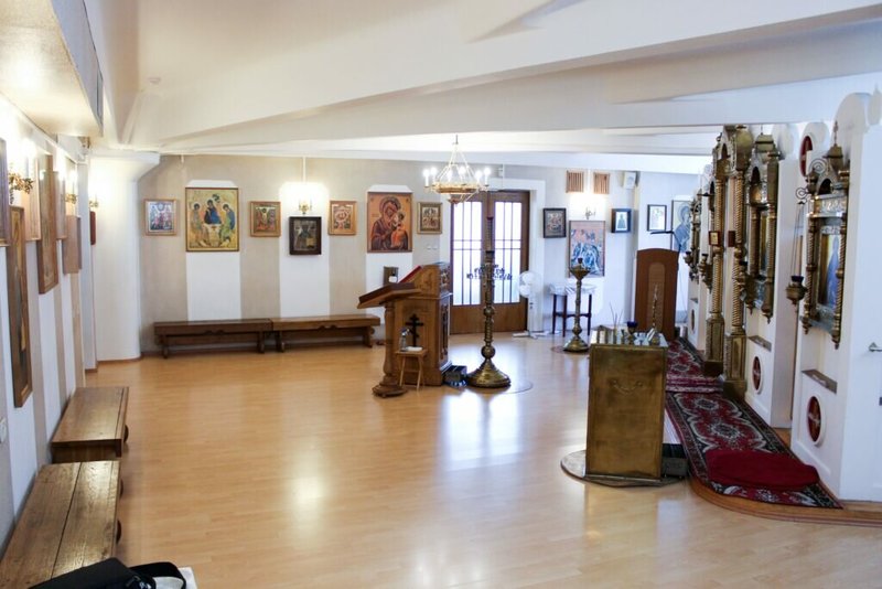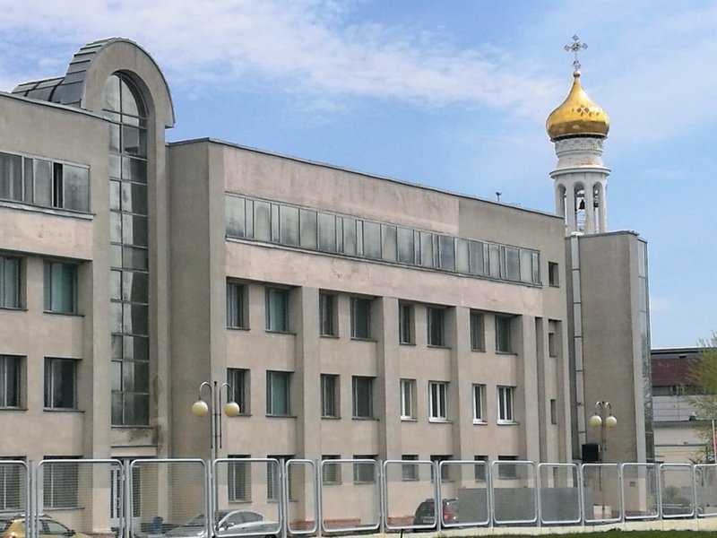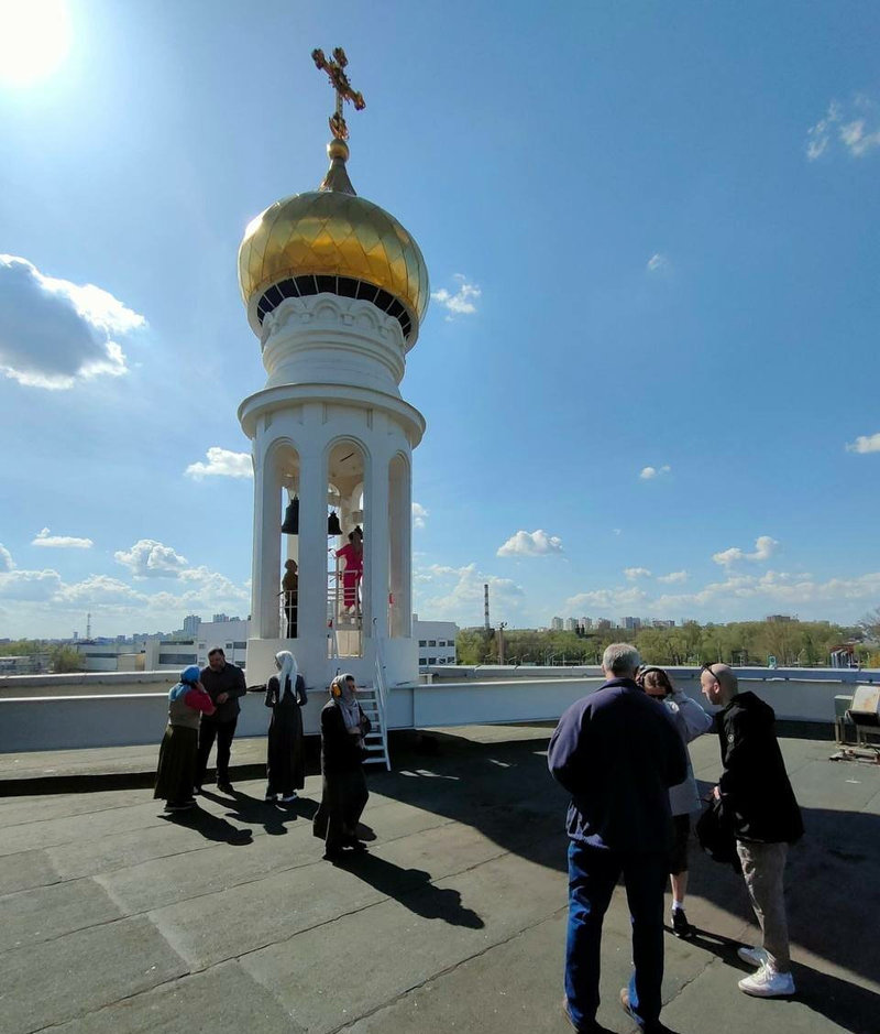 Но этот спорткомплекс интересен тем, что прямо в нем, на четвертом этаже, обустроена церковь. А на крыше — колокольня с золоченым куполом.