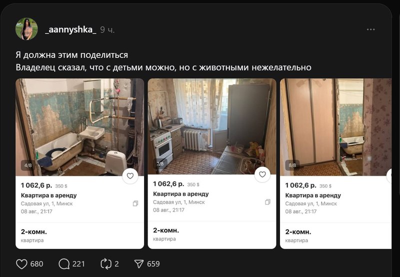 На одном из сайтов с предложениями продажи и аренды недвижимости появилось очень интересное объявление. Сдается 2-комнатная квартира в Минске. В санузле — абсолютнейшая разруха, причем и в прямом, и в переносном смыслах. Денег хозяин требует немалых, а в придачу выставил еще и серьезные ограничения. На объявление обратил внимание телеграм-канал «будни риелтора».