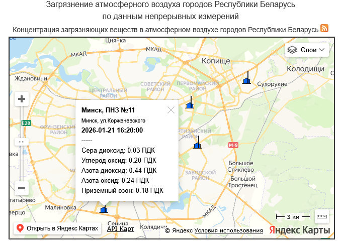 «20 января в утренние часы в 4 районах города: пр-т Независимости, 110а, ул. Тимирязева, 23, ул. Радиальная, 50 и микрорайон «Уручье» отмечено увеличение уровня загрязнения воздуха азота оксидом и углерода оксидом, максимальная из разовых концентраций которых достигла 2,8 ПДК».