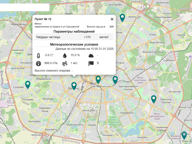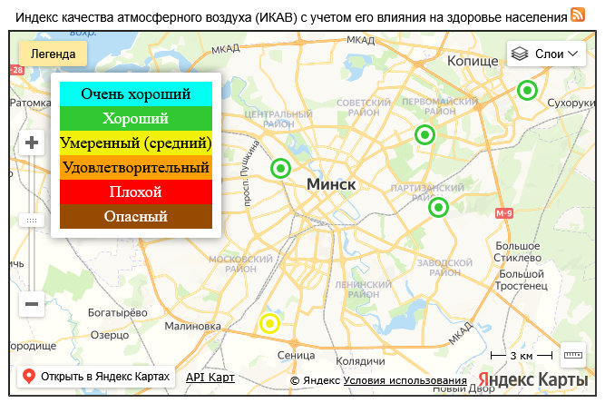 Государственное учреждение «Республиканский центр по гидрометеорологии, контролю радиоактивного загрязнения и мониторингу окружающей среды» Минприроды Республики Беларусь на своей онлайн-карте показывает, что почти все показатели воздуха в Минске в норме.