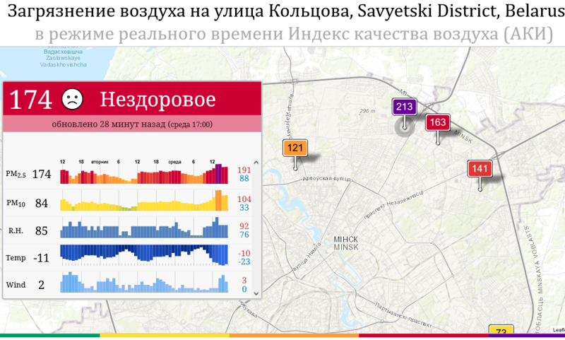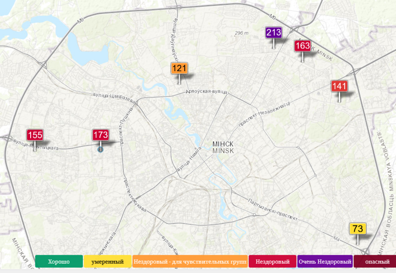 Если же мы откроем сайт одной из популярных служб мониторинга воздуха AQICN, то увидим такую картину по Минску, которую регистрируют всего 7 станций замера: