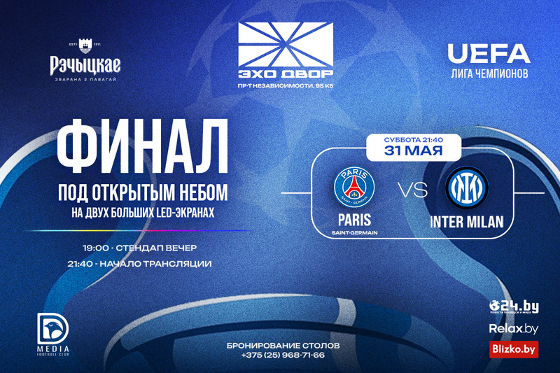 Кстати, уже 31 мая организаторы фан-зоны проведут прямую трансляцию Финала Лиги чемпионов в тестовом формате в пространстве «ЭХО ДВОР» по адресу Независимости, 95, к.5. Финальный матч одного из самых популярных футбольных турниров планеты можно будет посмотреть на больших LED-экранах, а помимо футбола в этот вечер на площадке будет много юмора. В 19.00 запланирован стендап-концерт, работа фуд-корта и тематических локаций. Вход также свободный, однако столик стоит бронировать заранее.