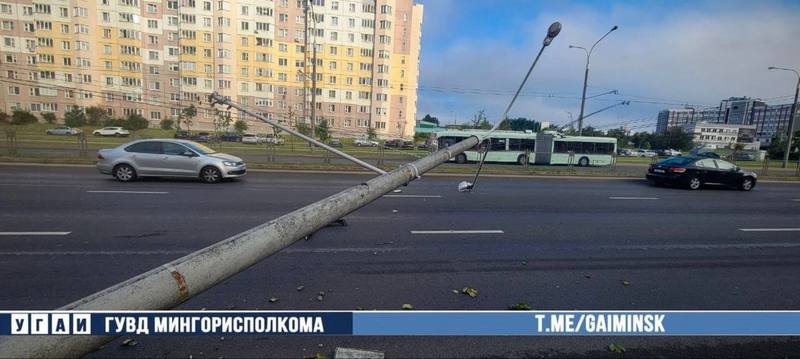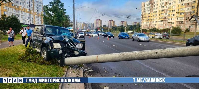ГАИ Минска сообщает: сегодня утром на улице Янки Брыля 21-летний водитель автомобиля Toyota не справился с управлением, выехал за пределы проезжей части и совершил наезд на осветительную мачту. Эта же мачта держала и троллейбусные провода (контактную сеть), так что если легковушки еще могли объехать упавший столб, то троллейбусы остановились.