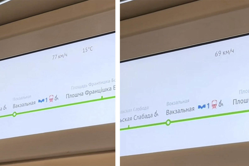 «Минск 2024 летит под 80 км/ч», – написал блогер. По видео можно судить, что он ехал на Зеленолужской линии. Отметим, что максимальная скорость была 77 км/ч.