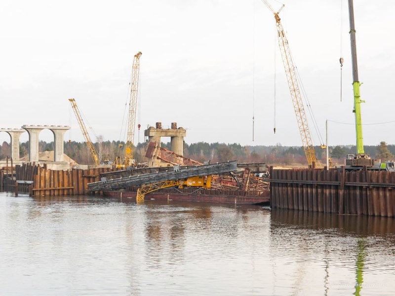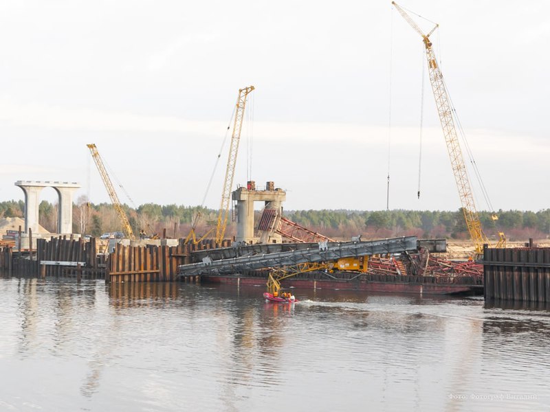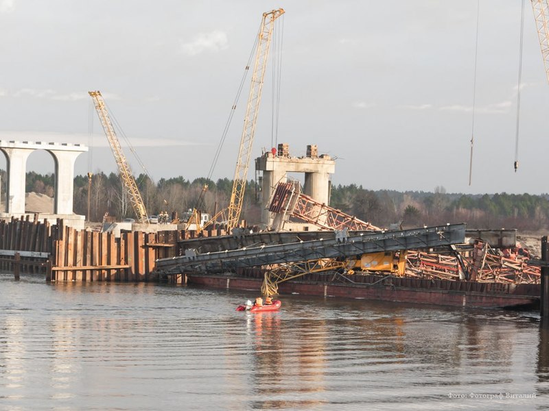 Руководитель "Гомельавтодора" Денис Ясько говорит, что «вследствие резкого завихрения потока воды в русле реки Припять произошел крен баржи, повлекший оползание остатков металлоконструкций с временных опор».