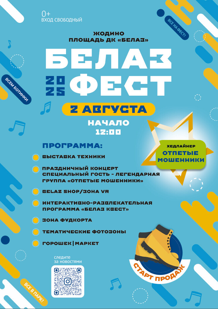 На «БелАЗ фест — 2025» стартуют продажи тех самых нашумевших ботинок БелАЗ. С музыкальной сцены фестиваля весь день напролёт публику будут развлекать модные диджеи, выступят группы Cosa Nostra, «Метро», Geshua, певица Гюнешь и другие артисты. Своим творчеством порадуют виртуозный электроскрипач Антон Саункин, цимбалистка Анна Шарковская, а также цирк «Мечтатели» из соседнего Борисова. Потанцевать, попеть песни прошлых лет можно будет вместе с завсегдатаями феста — солистками ретро вумен трио «Розовые розы».