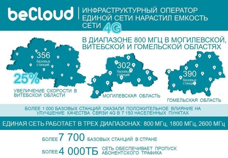 В конце февраля на 356 базовых станциях Витебской области радиочастотный канал в диапазоне 800 МГц расширили на 10 МГц. Это удвоило суммарный объем радиочастотного спектра. Пропускная способность LTE выросла на 56,8%, а средняя скорость передачи данных увеличилась примерно в 1,8 раза — до 21 Мбит/с.