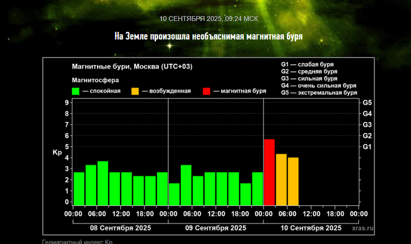 В ночь на 10 сентября на Земле стали зафиксировано необычное природное явленияе – магнитная буря, которая, к удивлению ученых, не была предсказана ни одним из прогнозов. Геомагнитная активность внезапно достигла уровня G2, что соответствует средней интенсивности бури.