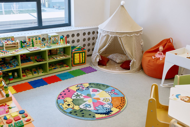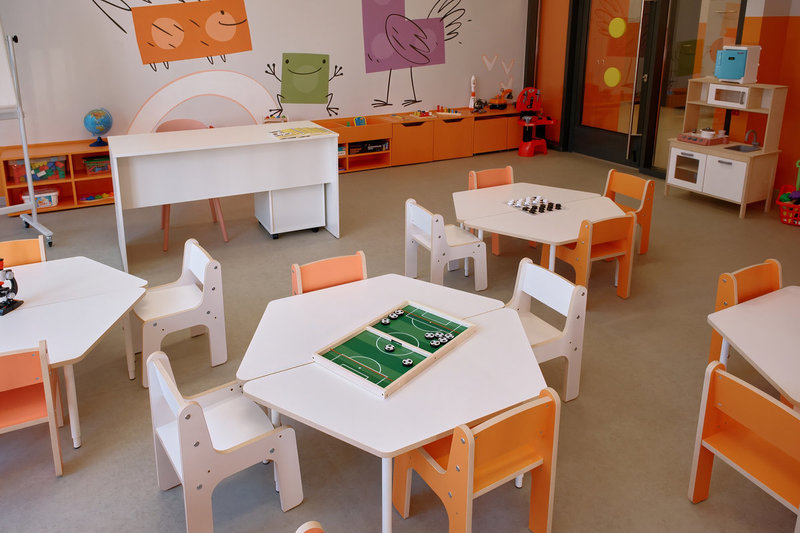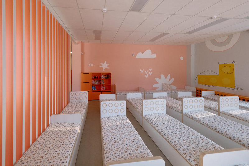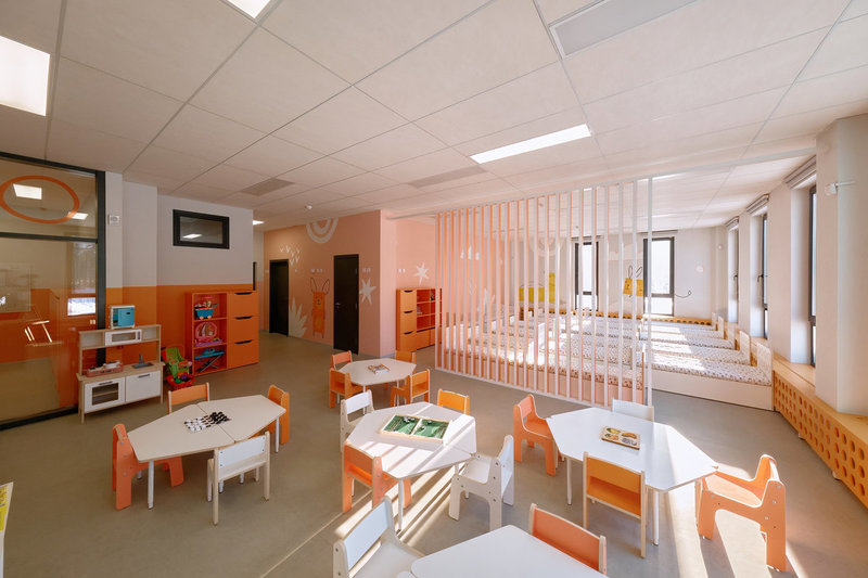 Интерьеры выдержаны в единой стилистике: светлые групповые с панорамными окнами соседствуют с яркими общественными зонами, где цветовые акценты поддерживают бодрое настроение, не перегружая восприятие детей.