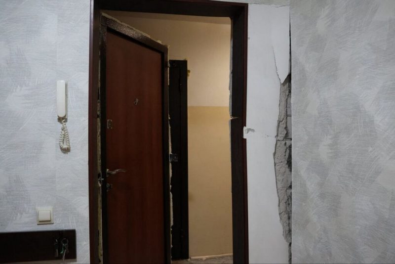 Крупного возгорания не возникло, однако взрывной волной была выбита входная дверь и повреждена межкомнатная перегородка. Стену пытались удержать от окончательного разрушения при помощи малярной ленты.