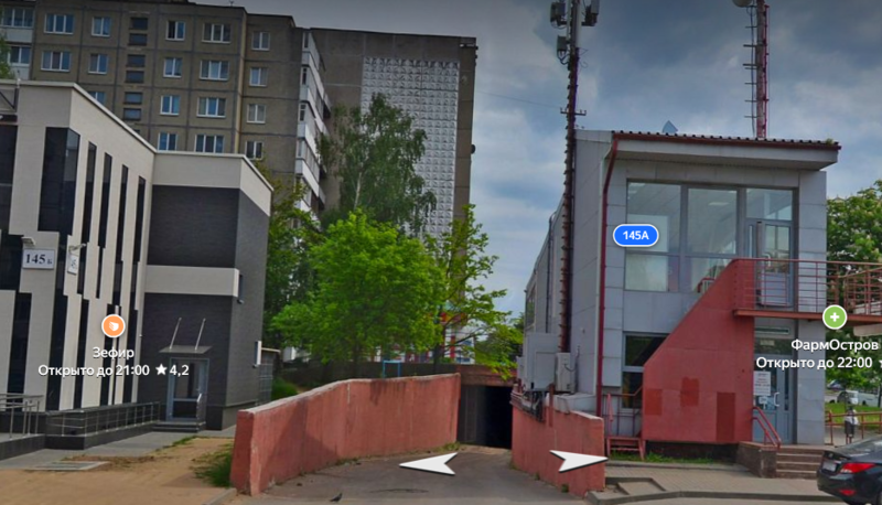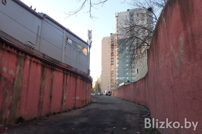 Отправляемся к северно-западному торцу дома, к перекрестку с безымянным проездом напротив кинотеатра «Салют». Между двумя зданиями с магазинчиками есть узкий проезд с повышающимися стенками. Местные жители нередко используют его как парковку.