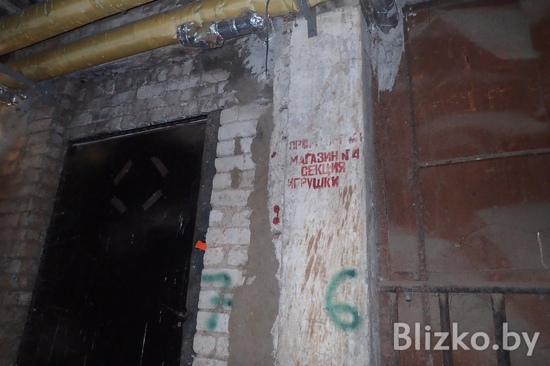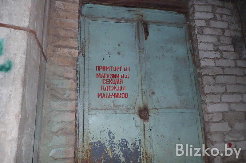 Двери заперты, но текст на них остался. И спустя полвека мы можем видеть: «Промторг №1, магазин №4. Секция игрушки», «Секция одежды мальчиков» и т.п. Тут нет освещения и, похоже, уже давно ничего не разгружают.