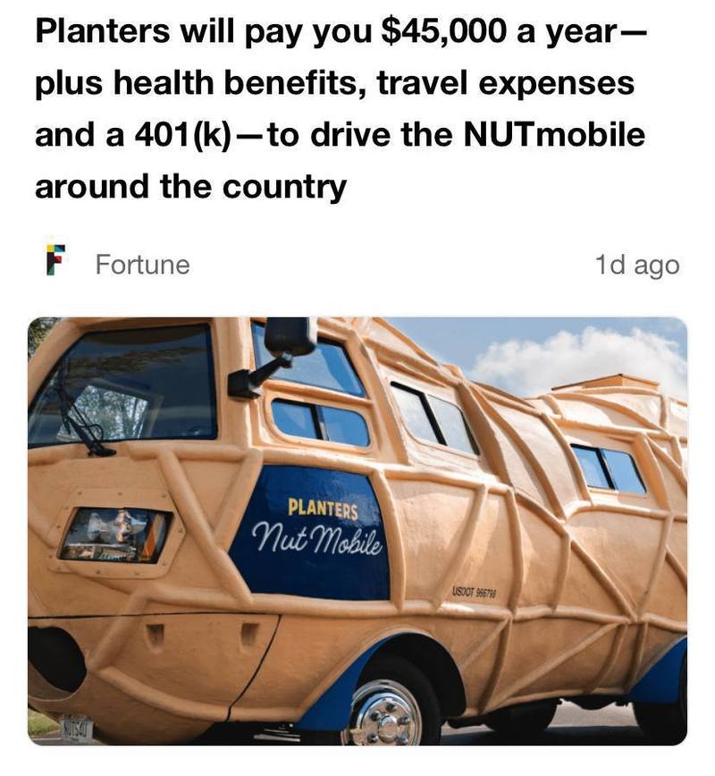 В США ищут водителя для необычного транспортного средства — автобуса в форме ореха кешью. Ездить придется по всей стране. Работодатель берёт на себя все расходы, включая питание, медицинское обслуживание и прочие издержки.