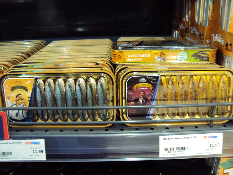 Необычные сладости выпускает российская фабрика «АтАг». Упаковка действительно напоминает банку от шпрот или кильки — овальной формы, желтого цвета, с изображением рыбных консервов. Даже названия соответствующие: «Застольный закусон» и «Закусон олигарха».