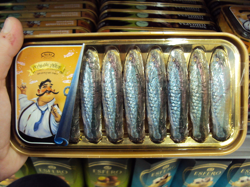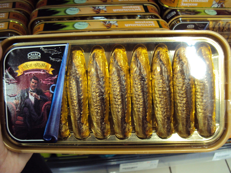 Данный товар, в отличие от других рыбных консервов, лежал в отделе с кондитерскими изделиями. Но это вовсе не ошибка работников магазина — рыбки внутри банок шоколадные.