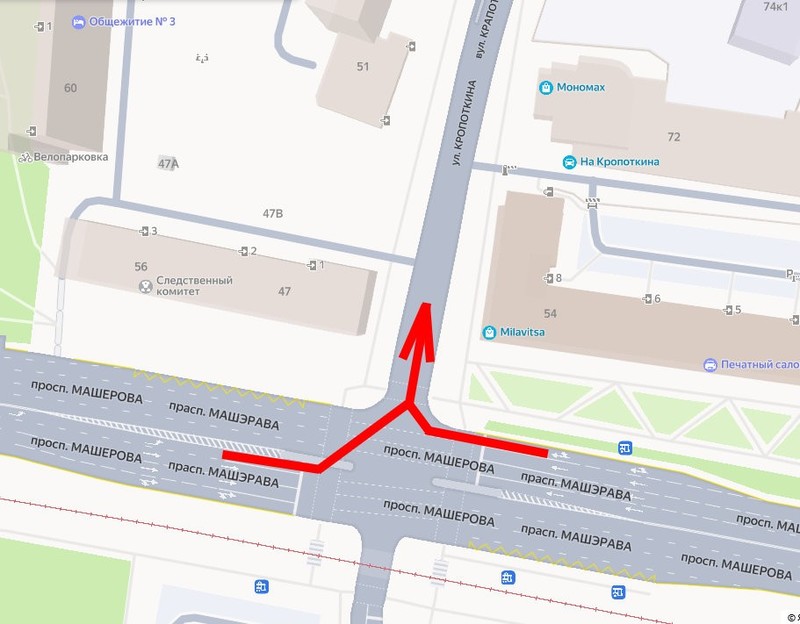 А движение по самой улице Кропоткина от Веры Хоружей до проспекта Машерова организуется со стороны Веры Хоружей в двухстороннем режиме.