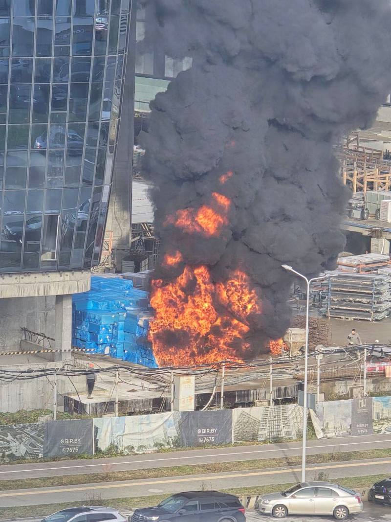 В телеграм-канале "Минск.Главное" в первые минуты пожара поделились фотографиями: видно, что горят штабели утеплителя.