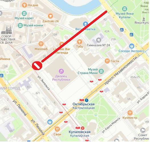 А с 14:00 10.08.2025 до 06:00 11.08.2025 будет ограничено движение всех видов транспортных средств на участке улицы Интернациональной от улицы Энгельса до улицы Янки Купалы.