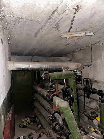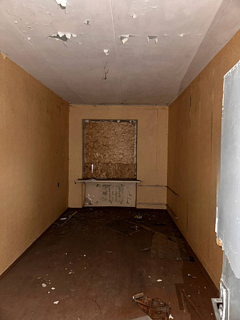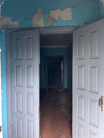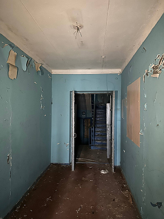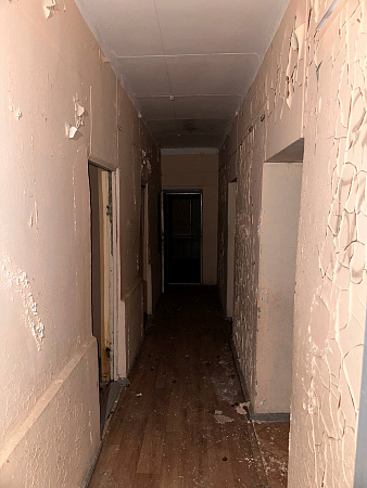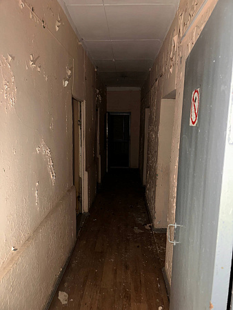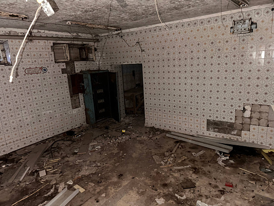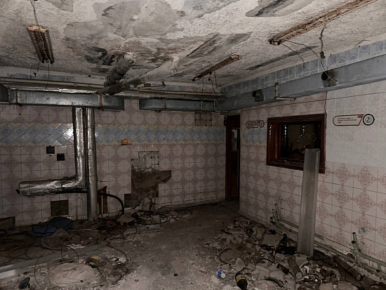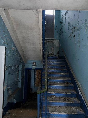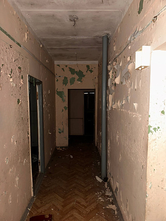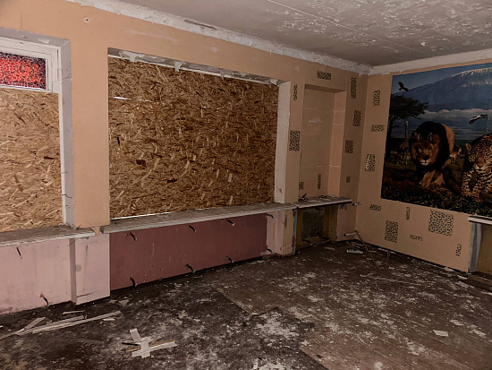 В интерьерах повсюду облупилась краска на стенах, поотваливалась кафельная плитка, осыпалась штукатурка, протерся пол. Батареи срезаны, окна забиты ДСП-щитами, а в подвале образовался склад бутылок.