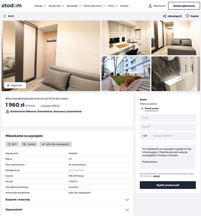 За месячную аренду придется заплатить 1.960 злотых, также требуется ежемесячный «чынш» в размере 290 злотых. В сумме получается 2.250 злотых, или примерно 581 доллар США по курсам Нацбанка Беларуси. Кроме того, надо будет внести залог в 2.000 злотых.
