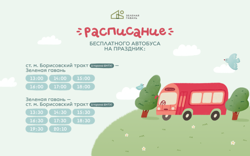 Вход на праздник свободный. Для удобства гостей предусмотрен бесплатный трансфер от станции метро «Борисовский тракт» с 13:00 до 18:00, а обратные рейсы из Зеленой гавани будут отправляться с 13:30 до 20:00.