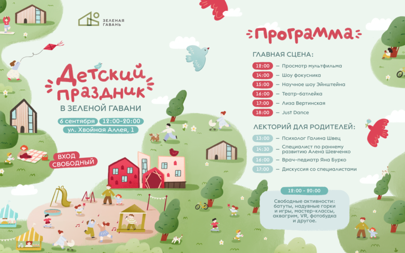 В жилом квартале Зеленая гавань 6 сентября пройдет масштабный семейный праздник с бесплатными активностями для детей и родителей. Основной площадкой станет территория нового детского сада по адресу Хвойная аллея, 1.