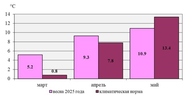 В целом средняя температура марта была +5,2°С, что выше климатической нормы на 4,4°С, пишет ThinkTanks. В итоге начало вегетации этой весной по южной половине страны произошло на месяц раньше нормального срока, отмечают синоптики.