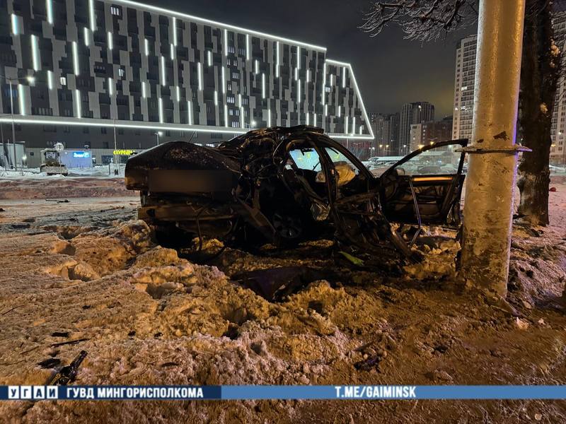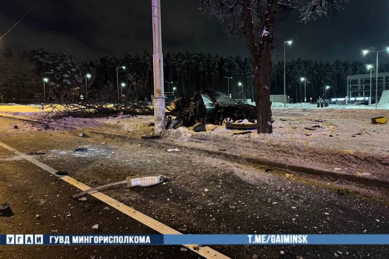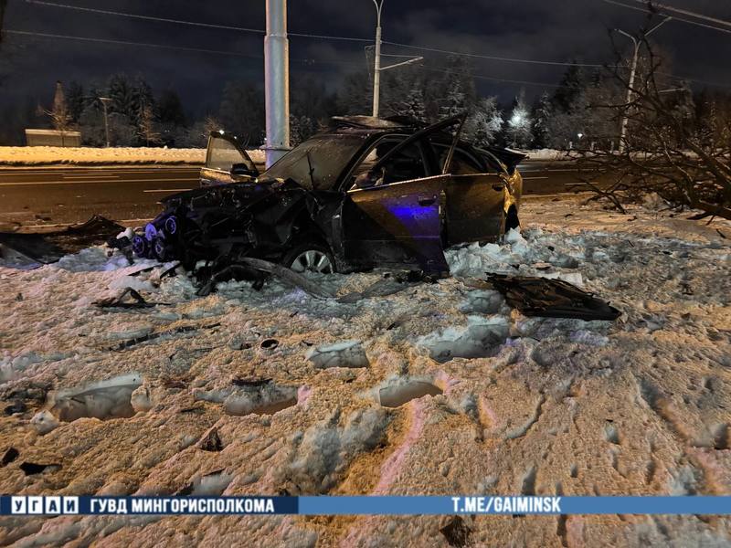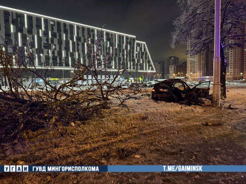 Авария произошла сегодня ночью на проспекте Независимости. По предварительным данным, 38-летний водитель Audi вблизи здания №134 не справился с управлением, выехал на полосу встречного движения, а затем – за пределы проезжей части, где врезался в дерево и осветительную мачту.