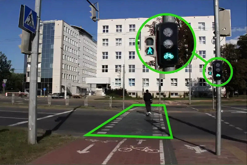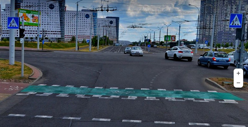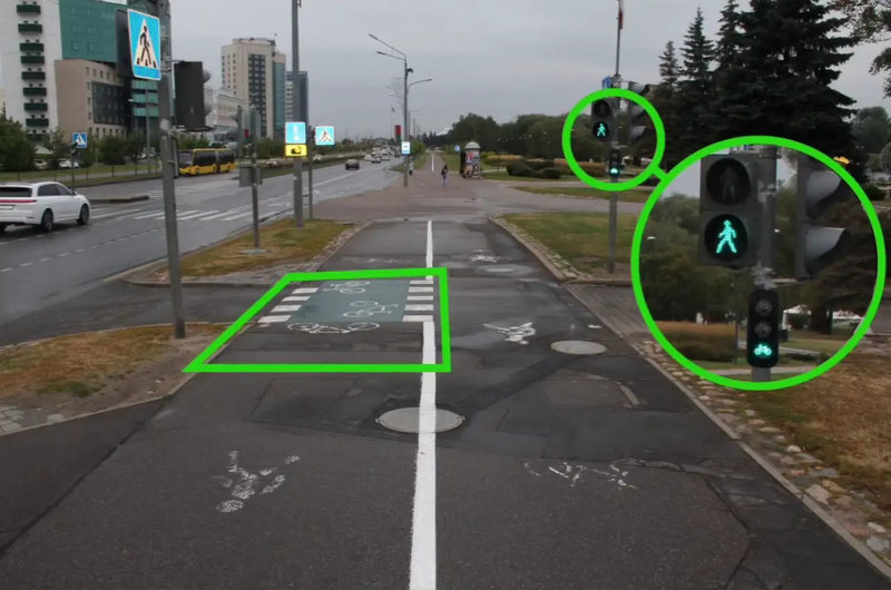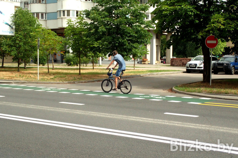 Так а для кого и для чего тогда написан пункт, разрешающий не спешиваться на велопереезде на перекрестке? Этот пункт применяется в том случае, когда велодорожка идет, например, по проезжей части улицы. Blizko.by рассказывал про такую велодорожку с велопереездом и велосветофором вдоль улицы Веры Хоружей в Минске.