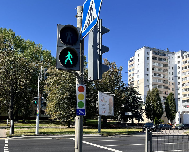 — Чтобы передвижение велосипедистов и пользователей СПМ было наиболее комфортным, на пешеходных переходах дополнительно будут устанавливаться велосветофоры. С учетом того, что это не быстрый процесс, для оперативности разработана и, согласно пункта 4 ПДД, главным управлением ГАИ МВД Беларуси утверждена специальная табличка. Если на велосветофоре горит зеленый сигнал, то велосипедист либо водитель СПМ может пересекать проезжую часть, не спешиваясь. Таким же образом они будут поступать в случаях, когда на пешеходном светофоре горит зеленый сигнал, а снизу размещена табличка, обозначающая велопереезд.