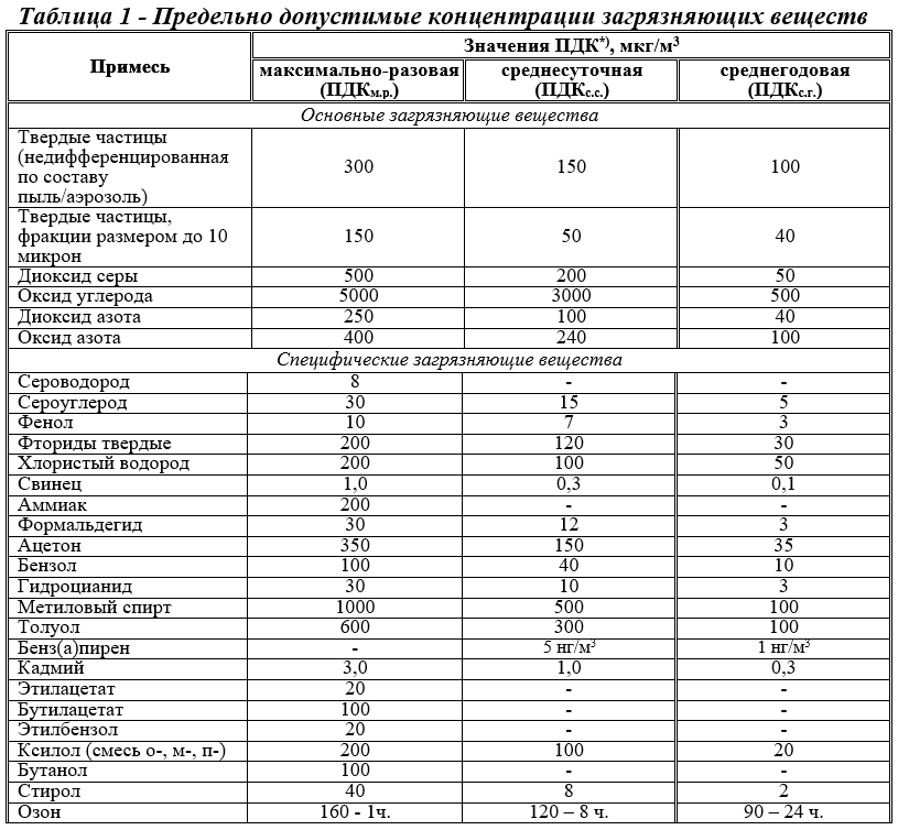 Из таблицы мы узнаем, что предельно допустимые концентрации бывают разовые, среднесуточные и среднегодовые. Измеряются основные загрязняющие вещества (твердые частицы, диоксид серы, оксид углерода, диоксид и оксид азота) и специфические (сероводород, сероуглерод, фенол, свинец, аммиак, формальдегид, ацетон, бензол и другие).