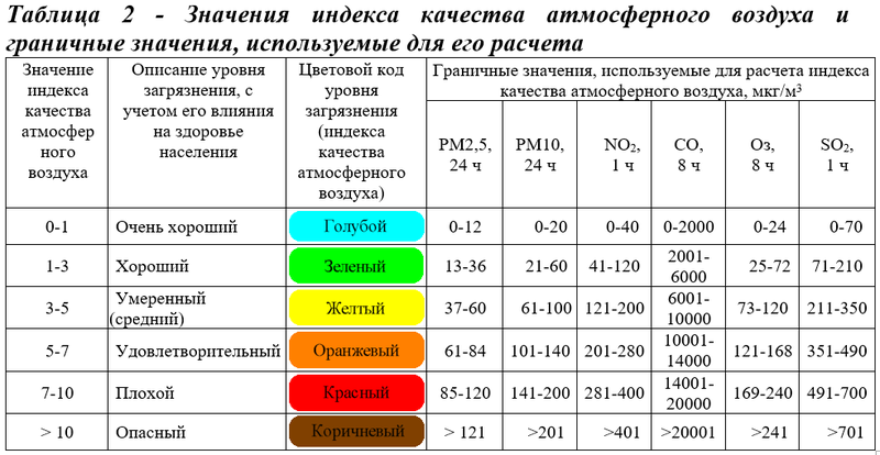 Можно сравнивать данные с приведенной выше таблицей предельных значений, а можно смотреть цветовой индекс качества атмосферного воздуха с учетом его влияния на здоровье. Голубые точки — все очень хорошо, зеленые — просто хорошо и так далее.