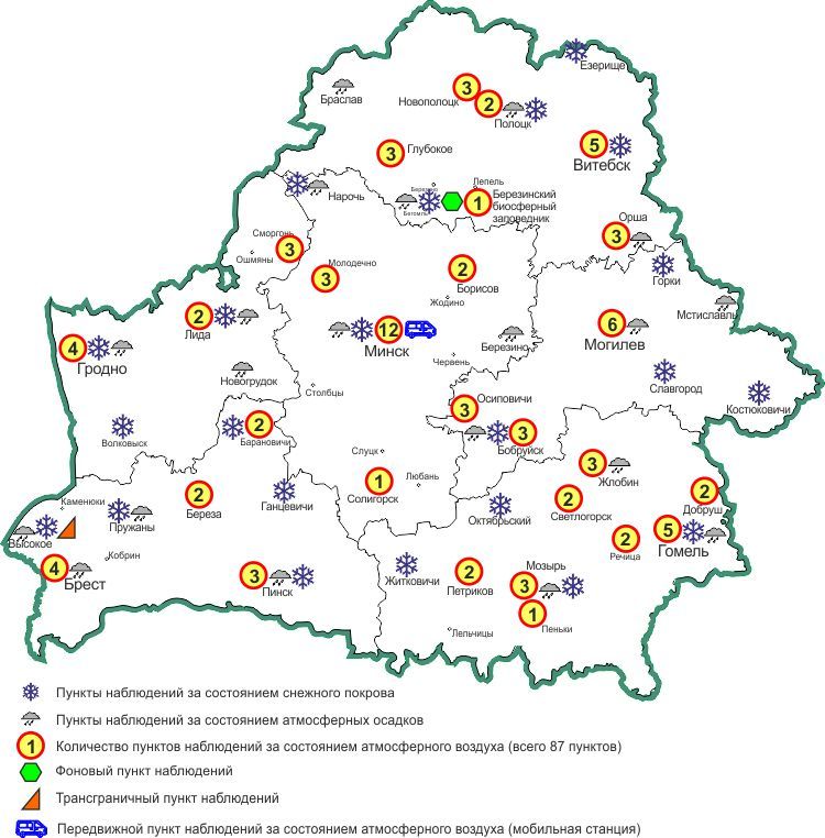 Всего по Беларуси 87 пунктов наблюдений за состоянием атмосферного воздуха в 28 городах.
