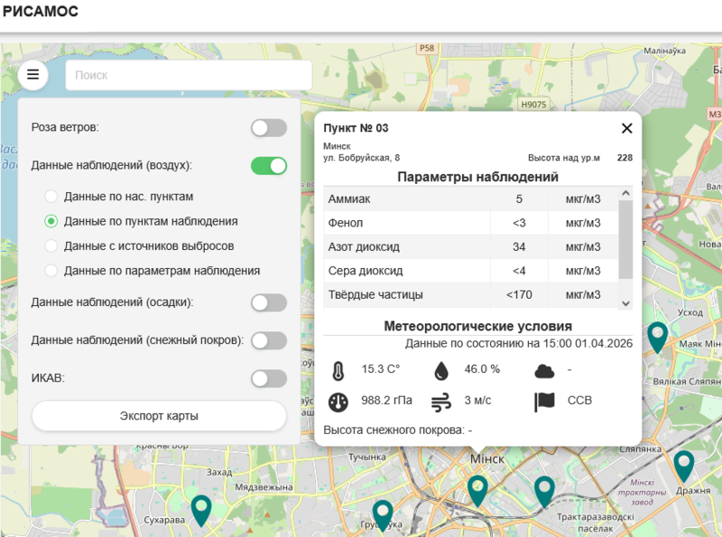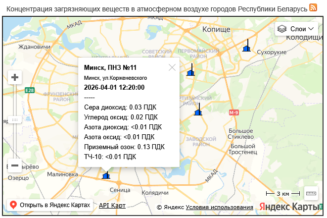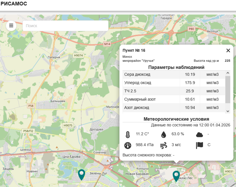 В каждом городе – по нескольку пунктов наблюдения. В Минске их 12 — это те самые, что мы показывали выше на карте Белгидромета. Но если там можно было просмотреть данные только по 5 из них, то на карте РИСАМОС сведениями поделятся все 12.