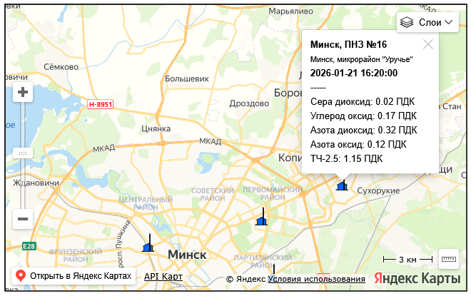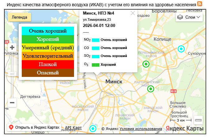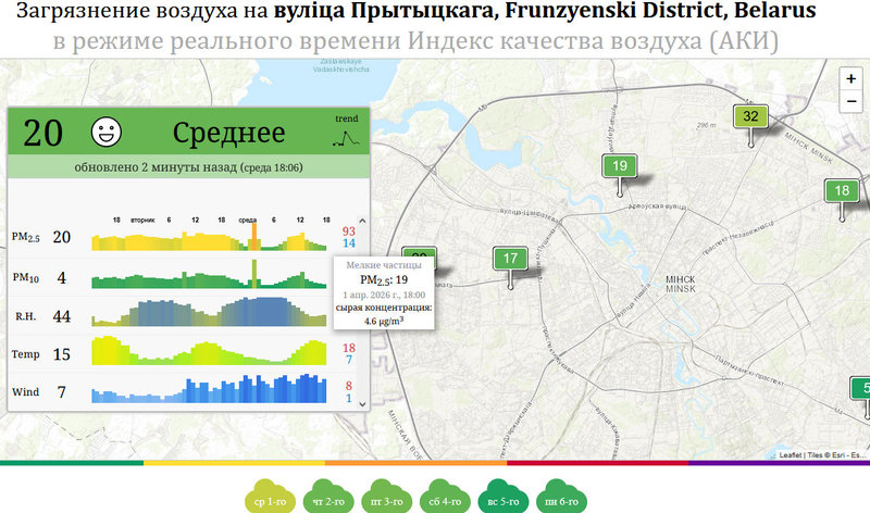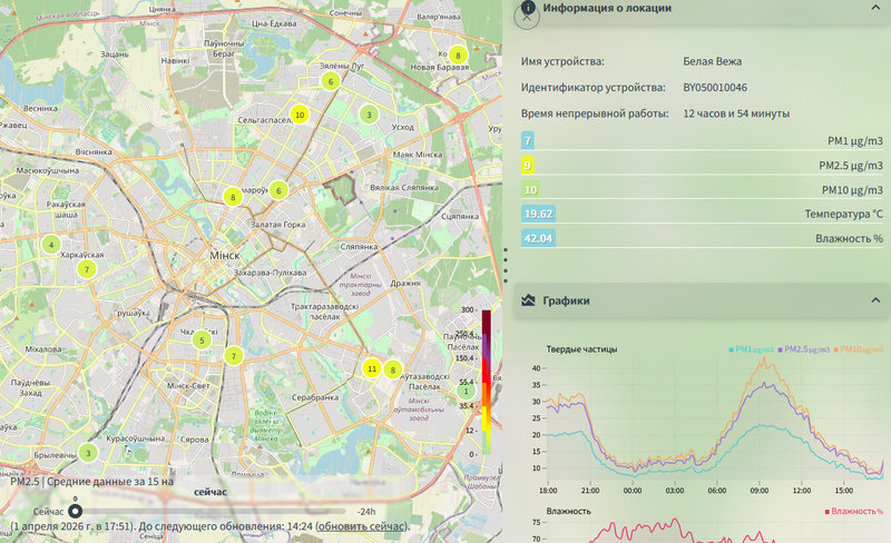 И вот здесь уже можно найти данные и по ТЧ-10, и по ТЧ-2.5. Например, та же станция в Уручье, которая на сайте Белгидромета цифр по ТЧ-2.5 не показывала, тут уже выдает: на 1 апреля 2026 — 25,9 мкг/м3.