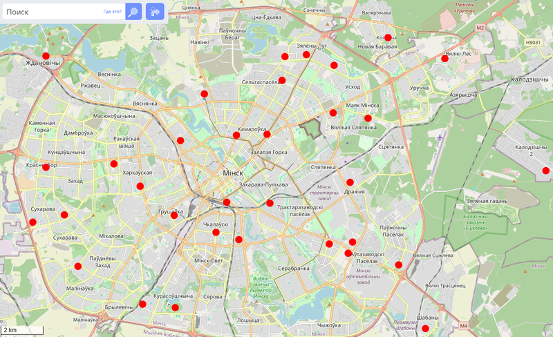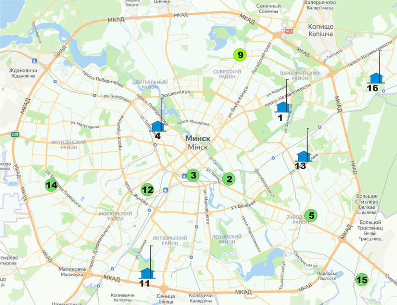 Мы нанесли на карту Минска разные места размещения датчиков состояния воздуха от всех рассмотренных выше сервисов. Итого получилось 27 внутри МКАД и еще 5 в ближнем «замкадье». По мере застройки новых жилых комплексов (например, Северный Берег) их число будет наверняка расти.