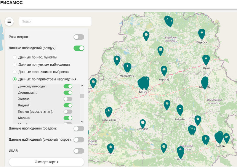В настройках можно выбрать данные по конкретным параметрам наблюдений. Их здесь собрано 56! И если мы выберем, например, те же самые ТЧ-2.5, то увидим, что эти данные доступны в 17 городах. Причем если в Минске такая точка одна, то в Осиповичах, Молодечно, Сморгони, Глубоком, — по 3.