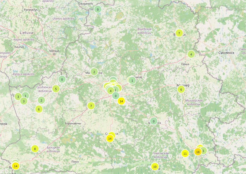 Всего охвачены 36 городов Беларуси, в которых установлены 294 датчика.