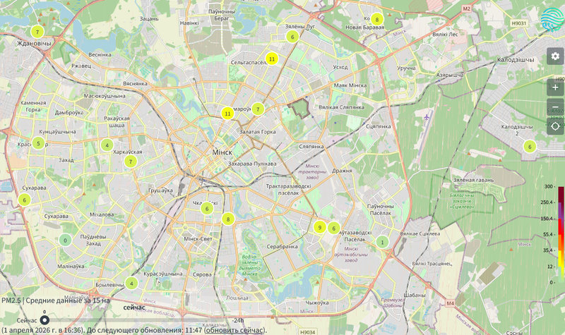 В Беларуси охват не очень большой: Минск, Гродно, Брест, Лида, Речица, Браславские озера и деревня под Оршей. В Минске работают шесть станций-датчиков, в основном в северной части города.