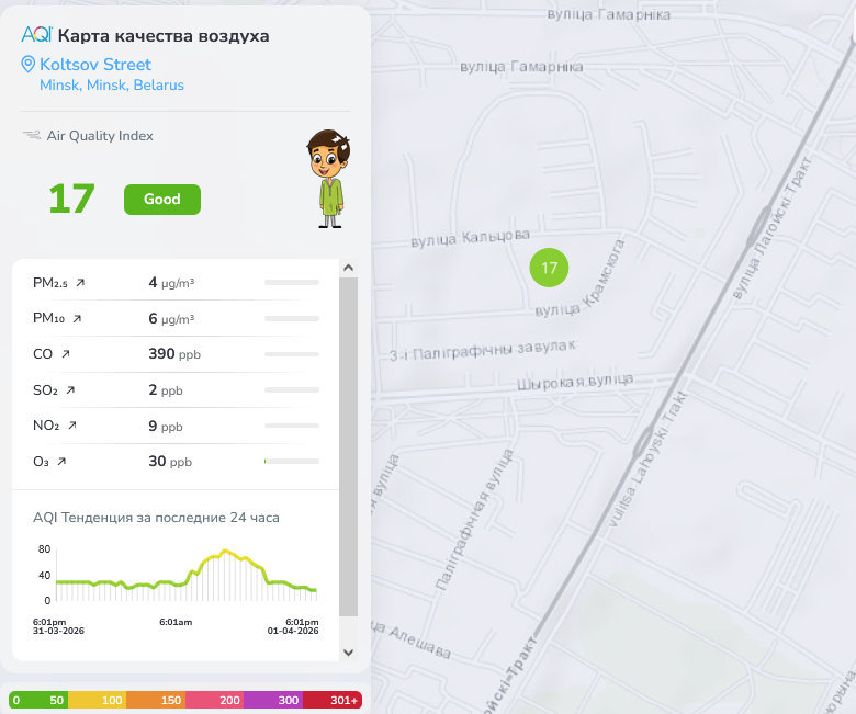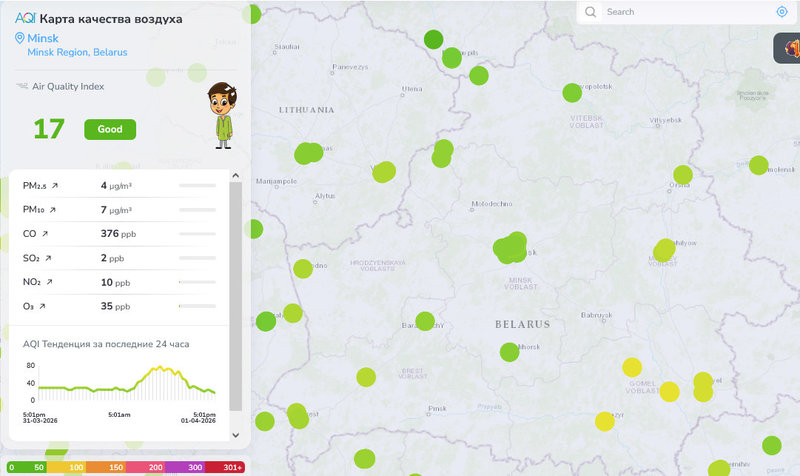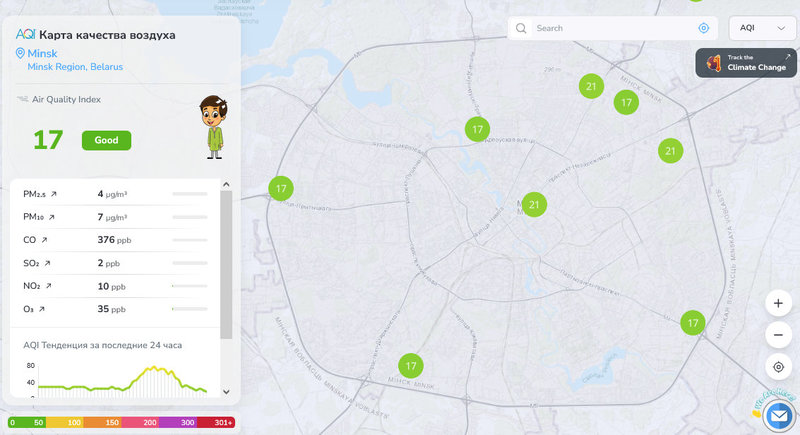 И еще один сервис: AQI (Air Quality Index) — зародился в Индии, работает по всему миру. В Беларуси покрыты 15 городов, а в Минске работают 8 станций отслеживания. Есть хороший перевод на русский.