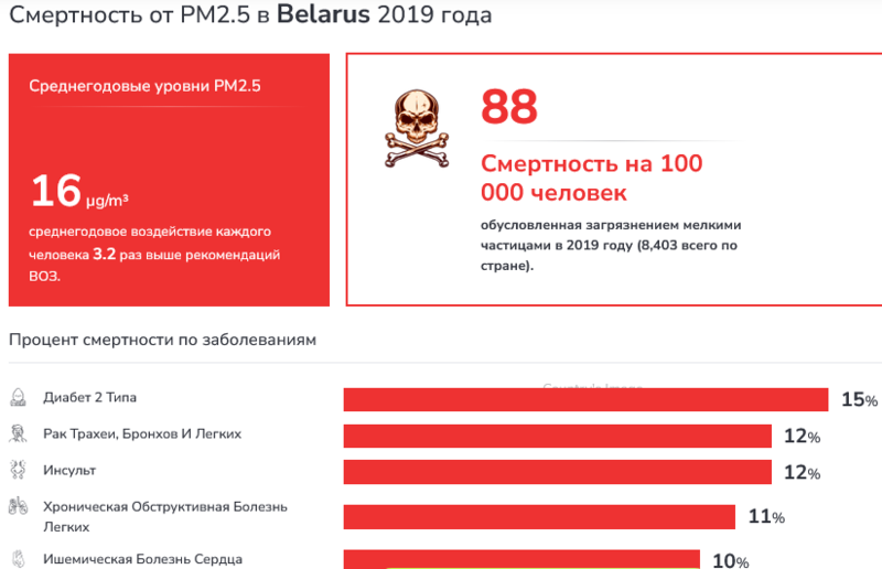 Также сервис показывает уровень смертности от заболеваний, вызванных мелкими частицами. К этим данным надо относиться с очень большой осторожностью, потому что мы не знаем, откуда сервис берет статистику по Беларуси.