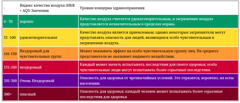 Такие цветовые таблицы приняты во всем мире — с такими же или похожими цветами. Вот, например, цветовая шкала китайского сервиса AQICN.
